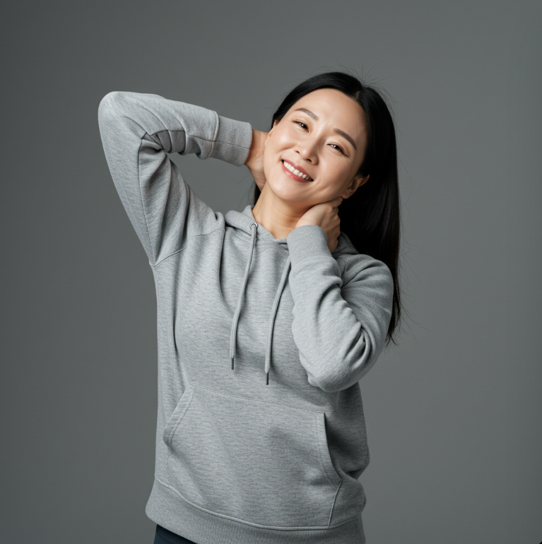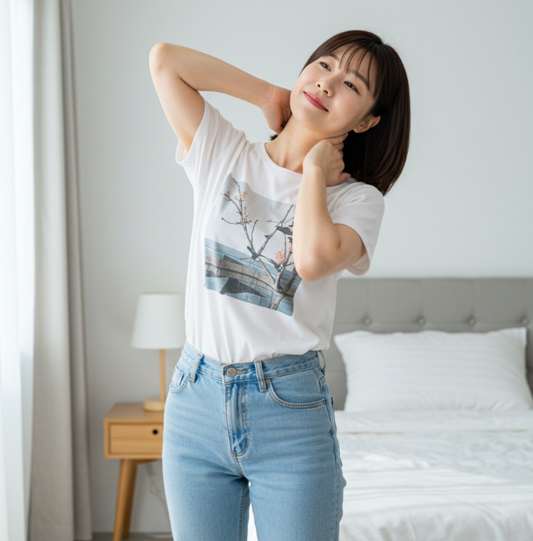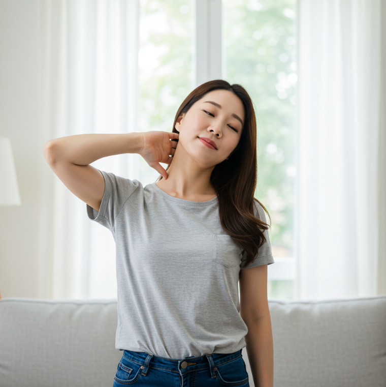 - 고개 기울이기: 똑바로 서서 양손을 뒤통수에 대고 고개를 한쪽으로 기울인 뒤 10초간 유지합니다. 반대쪽도 같은 방식으로 3회 반복하세요.
